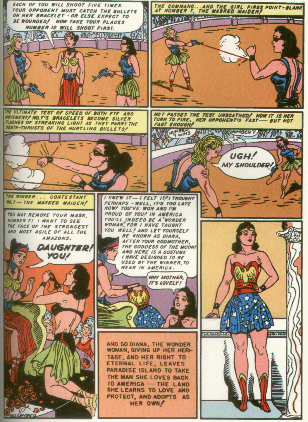 Wonder Woman originates from an uncharted secret Paradise Island populated by Immortal Amazon Women. Steve Trevor's plane runs out of gas and ends up crashing on the island. The women (Princess Diana among them) find he is injured and tend to his wounds. Because of World War Two, they decide it's time to get involved with the outside world again. They hold a contest to see which of the Amazon women is physically best to battle in the world of men. A masked Princess Diana (acting against her mothers wishes) enters and wins the contest. She is given the title Wonder Woman and a costume to match. Wonder Woman decides to go to the United States to be with Steve Trevor and to help defend America.