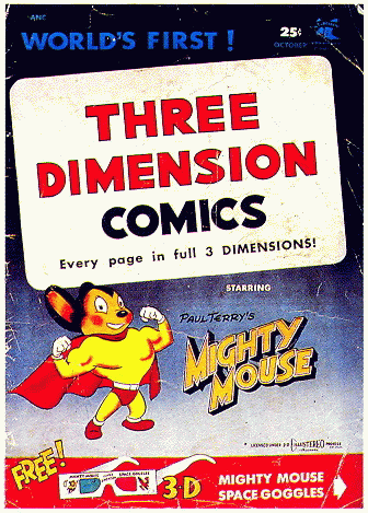 Do to the success of the Mighty Mouse 3D, many publishers did 3D books. After seeing the Mighty Mouse sales figures St. John Publishing converted an entire floor of a building into an assembly line to make all their comics 3D regardless of their content. By the 10th or 11th 3D book, the sales dropped radically to 19% sell though (meaning the remaining 79% were returned). Another thing around this time inspiring 3D comics was a 3D Horror movie. The movie was called House of Wax and it starred Vincent Price. Thanks the magic of 3D people could now see the blood spurting right off the page in comics like House of Terror done in October of 1953. Over a four month time period over 30 different 3D comics were done. The 3D fad has come back for brief periods throughout comic history.